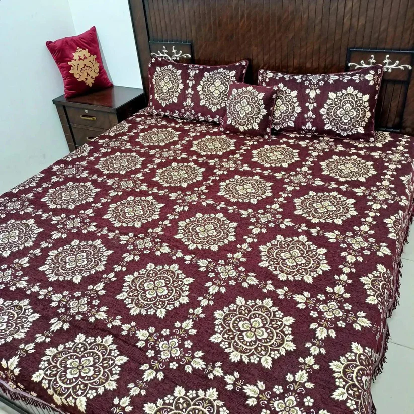 Luxurious Velvet Jacquard 4-Piece Bedding Set - King Size Bed Sheet, Pillow Covers, and Cushion Cover ₨3,750.00